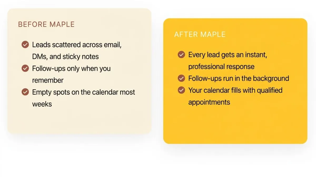Maple Marketing Company installs ready-to-go automation systems that capture leads, follow up instantly and book appointments so you can focus on running your business.